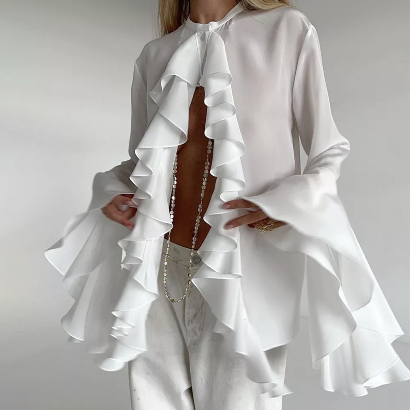 • Белая рубашка свободного кроя с воланами (размер 42/46);